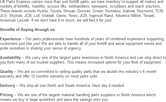 For your entire fleet of lift-trucks, we offer the best prices on all our parts. If you are interested in getting a quote for our parts or attachments, give us a call now at:
